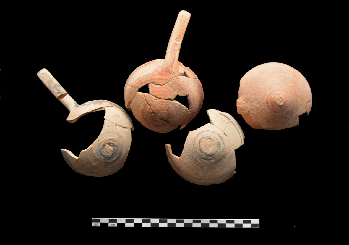 The ceramic material from the West Stoa that forms the basis for the dating of the destruction belongs to three different types of assemblage. The first comprises a group of 17 complete or nearly complete vessels that were lying directly on the ground floor of the stoa. The vessels were all plain and heavily burnt and found close to the opening of the West Stoa into one of the rooms of Building E, to the west and under the debris of the Stoa. The preservation and stratigraphic position of the vessels clearly show that these were in use at the time of the destruction (floor deposit in situ). The second group of vessels was almost all of the same small shape, namely the painted dipper. Seven such dippers were found in the red layer or in the debris from the collapse of the West Stoa, occasionally in concentrations. It is impossible to know where these pots were originally located, but the most likely explanation is that they were in one of the rooms of the first storey. They were probably incorporated within the red layer when the upper storey collapsed. Finally, the third group is the abundant sherd material that was mainly found in the red layer on top of the ground floor. These are redeposited and could date from either the construction or destruction phases of the palace.