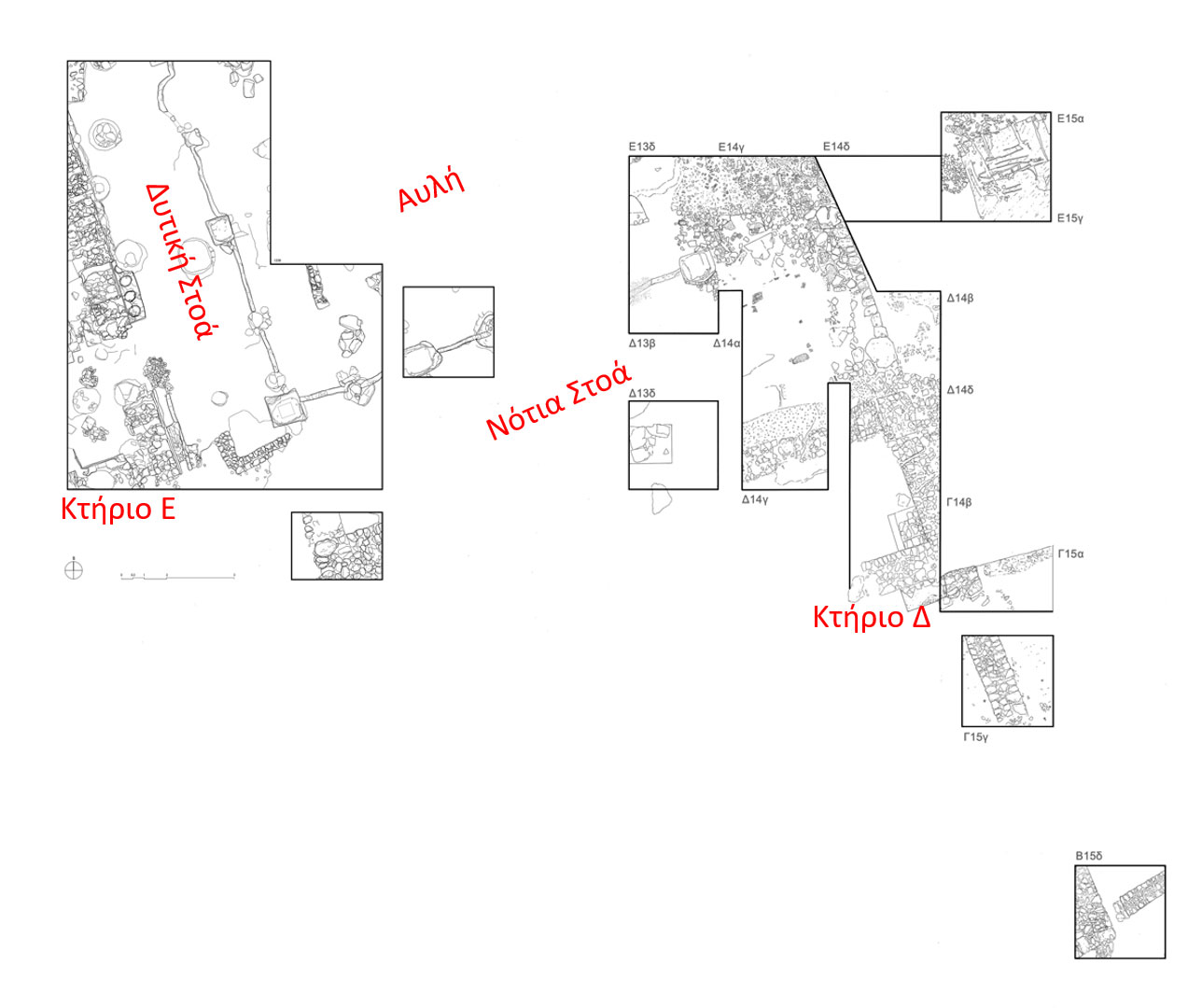 The excavations in Sector III identified the remains of several large impressive structures. These include Building Delta, Building Epsilon and two Stoas (Fig. 1). Building Delta is located in the south-eastern part of Sector III. Only the east wall of this building and a small part of a room to the north-east have been excavated. The external east wall of the building is 26 m long, and the room was reoccupied during the Byzantine period. For this reason, a large part of the Late Helladic (LH) layers has been lost. The pottery recovered from two trial trenches has been dated to LH II and LH IIIA. But further excavation is needed to better understand the large structure referred to as Building Delta, to establish its plan and possible construction phases, as well as its connection with the other structures.